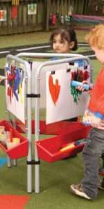 Three sided easel, designed specifically for very young children, including under 3s. The sturdy easel tray is easy to attach and remove from the frame for storage and cleaning and the chunky, durable frame also folds down for storage. The clear painting panels are made from tough, shatterproof, weather resistant plastic which is very easy to clean.Size (one side): Size H59 x W95cm, Panel H50cm. Standard delivery times may not apply to this product. Please contact Customer Care if you require further information.