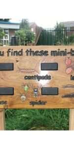Can You Find Minibeast wooden outdoor board. A large board made from solid Yorkshire timber featuring hand carved and painted images of common minibeasts. Each minibeast has a chalkboard next to the image so children can tally up their sightings and finds of each creature. Posts not provided. Size: 60 x 20cmStandard delivery times may not apply to this product. Please contact customer Care if you require further information.