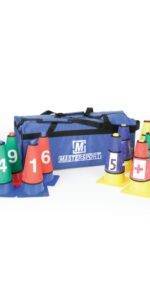 The set comprises 20 Plastic Cones (height 30cm), 10 Nylon Numbered Cone Sleeves (numbered 1 – 10), 10 Nylon Clear Pocket Cone Sleeves (featuring a clear vinyl window into which paper or cards can be inserted) and a holdall.