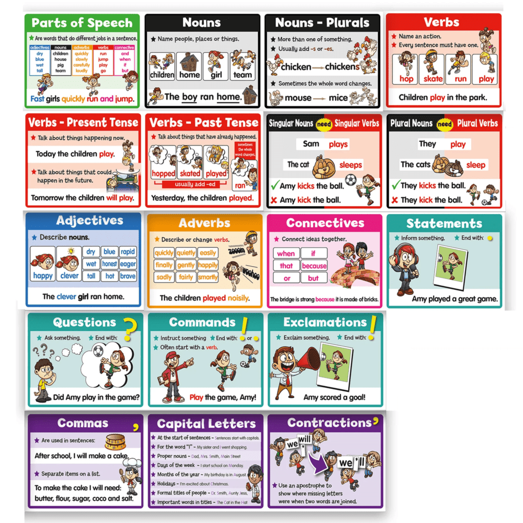 Simple explanations of each grammatical term in the UK curriculum are given on large 310 x 260mm panels. Display as a wall chart, a frieze or cut into individual posters for class lessons. The KS1 Frieze has 18 panels and measures 5.6m end to end