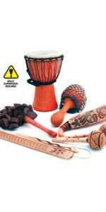 This pack contains 7 multicultural musical instruments from around the world. Includes: 30cm hand-carved djembe drum (large enough to make a really fantastic sound, but an easy size for children), gourd cabassa from Ghanaguiro gourd rainstick from Peru (can be used as a shaker, guiro or rainstick)2 gourd shakers from Kenyaguiro and stickju-ju cluster on a stick from Ghana. Please note that these are handmade instruments. Adult supervision is required. Standard delivery times may not apply to this product. Please contact Customer Care if you require further information