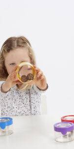 Brightly coloured scoops with clear tops and scissor handles for safely capturing, holding and inspecting insects or plants.