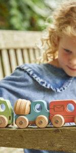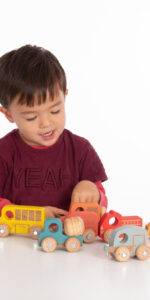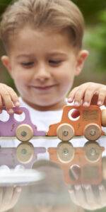 Colourful solid beechwood vehicles, each with four rotating wheels, metal axles and lasered markings. The lasering creates a slight indentation in the wood