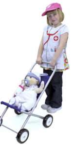 A very sturdy and simple design dolls pushchairs, with 4 chunky wheels.