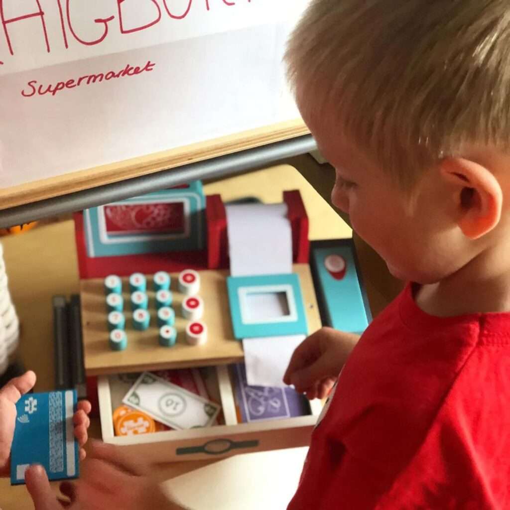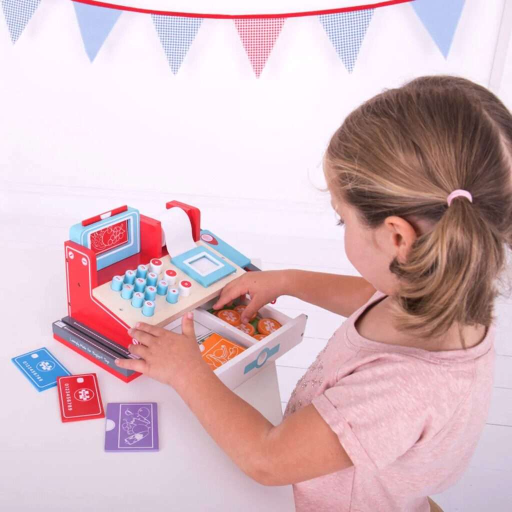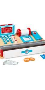 Made from high quality wood and decorated in bright colours, this shop till comes complete with wooden and paper money, a ?wireless? credit card, product plinths, till roll and a scanner to ?beep? the shopping items with. Age: 3 years+. Colour supplied may vary.Size: W31 x D15 x H16.5cm