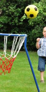 Free standing tubular steel basketball hoop with a nylon rope net. Designed at a comfortable height for children – or adults with restricted movement