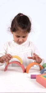 Beautiful smooth solid beechwood nesting arches in the seven rainbow colours, with a natural finish to show the grain of the wood. The inner block is a solid 3D semicircle