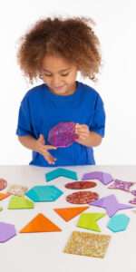 Sparkling colour glitter geometric shapes in 7 rainbow colours. Each colour represents 3 different 2D shapes, including regular and irregular versions. They are the ideal resource for learning about shape names?