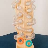 Housing labyrinth made of wood. The main body of fixed plastic tube with holes, in which the balls fall (supplied with labyrinth – 4 pcs.). Balls roll down the transparent plastic chute.