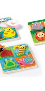 Save money when you buy this Special Offer which includes three Touch and Feel Wooden Puzzles – Farm, Safari and Bugs. Each puzzle has four chunky pieces which lift out to reveal different textured surfaces. Age: 12 months +.Each puzzle size 20 x 20 x 2.5cm.