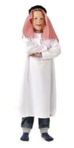 White tunic made in durable bistretch, the keffiyeh (headdress) is red and white print held in place with an adjustable black head band. Age 3 years+.