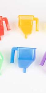 Fun colour funnels, the perfect size for children to use in explorative play with sand and water, for colour mixing and matching, and to experiment with volume.