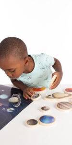 Smooth and tactile plywood discs, colour printed on one side with beautiful clear photo realistic illustrations of our sun, Mercury, Venus, Earth, our moon, Mars, Jupiter, Saturn, Uranus, Neptune and Pluto.