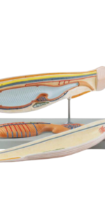 This three-part model, enlarged to 10X life-size, shows the morphology of an Ampioxus. The inner anatomy can be easily studied thanks to the longitudinal section; all the main structures, such as cerebral vesicle, neural tube, nephridium, gonad and circulatory system, are numbered and referenced on the accompanying manual.