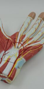 This 3-part model, enlarged 2X life size, shows the anatomy of the hand, including muscles, nerves, ligaments, vessels and bone structures. Aponeurosis is removable for closer examination.