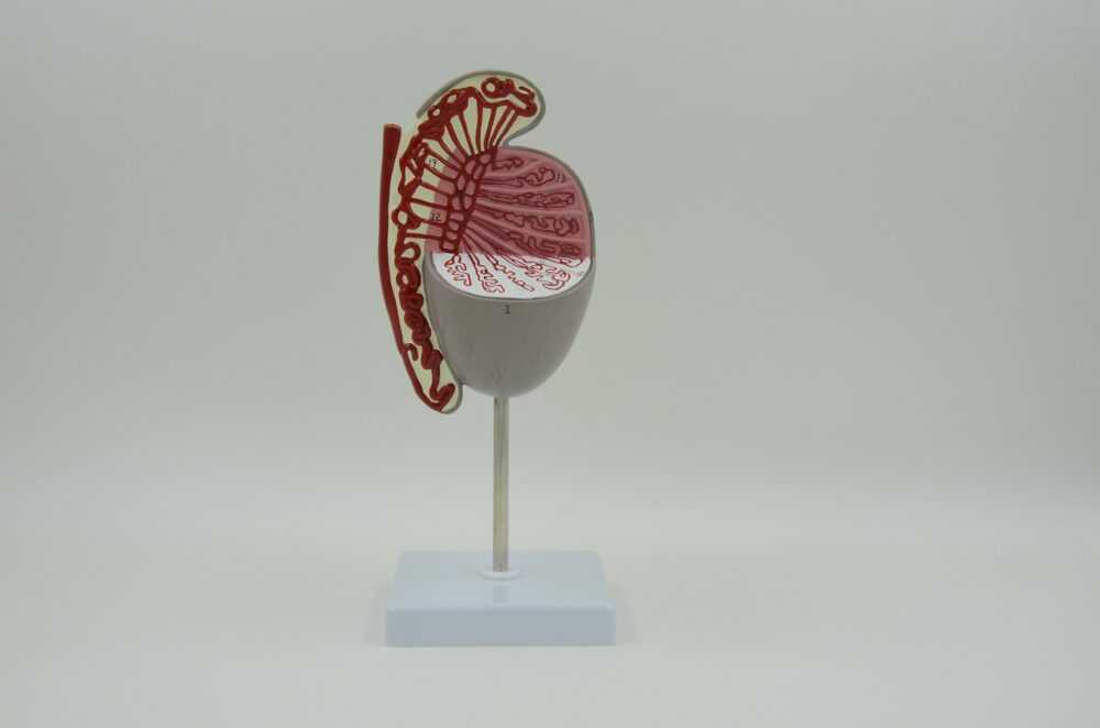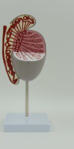 This model shows the medial and sagittal section of the human testis including epididymis, ductus deferens, seminiferous tubules and rete testis.