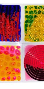 Engaging tactile and visual experience: set of 6 sensory tiles filled with textured liquid gel for captivating tactile and visual exploration, encouraging movement and engagement.