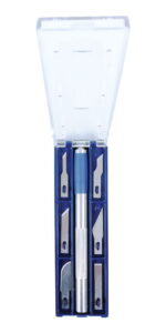 Scalpel handle and blade set, in a handy storage box.