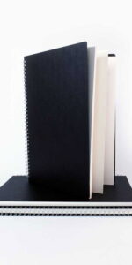 Portrait Euro Poplin Hardback Sketchbook. Lacquered Black Poplin covers with rounded corners. 7/8″ silver wire-o binding.