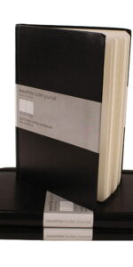 Portrait Bullet Travel Journal – Contains printed dot grid pages for journaling on the go. Black hardback cover with sewn binding. Interior back pocket. Elastic retaining band and ribbon marker.