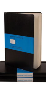 Portrait Alternate Plain/Lined Travel Journal – Perfect for notes and sketching on the go. Black hardback cover with sewn binding. Interior back pocket. Elastic retaining band and ribbon marker.